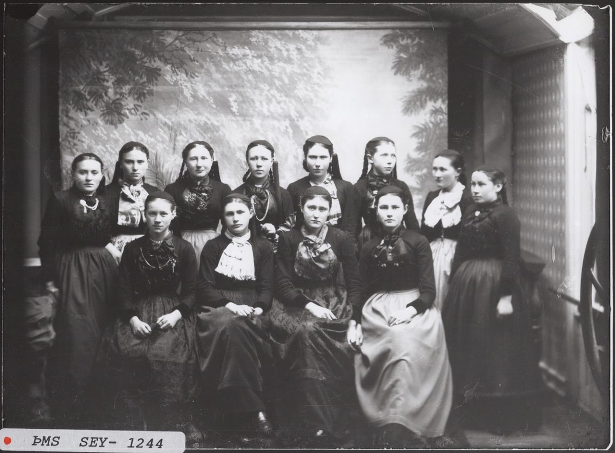 Hópmynd. 12 ungar konur. Kona Ólafs Eiríkssonar, söðlasmiðs 8 fv. í efri röð, Hansína Eiríksdóttir, ekkja Benedikts Þórarinssonar. 2 fv. í efri röð, Pauline Charlotte Amalie Sæby, kona Ágústs Jósefssonar. 2. fv. í neðri röð, Ragnheiður Guðmundsdóttir, Ofanleiti, 3. fv. í neðri röð, Sigurborg Jónsdóttir, 3. fv. í efri röð.