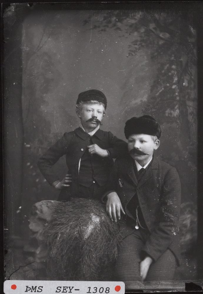 Andrés Fjeldsted, augnlæknir og Jón Vestdal Jónsson, framkvæmdastjóri, rak þaravinnslu á Álftanesi. Tveir ungir drengir með gerviskegg.