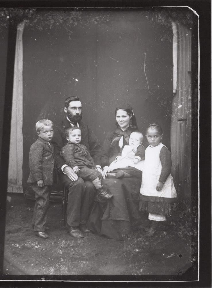 Hjónin Ástríður Guðmundsdóttir og Guðmundur Guðmundsson bóksali á Eyrarbakka með börnum sínum. Yngsta barnið Ástmundur Guðmundsson, næst elsta barnið, Halldóra Guðmundsdóttir Andersen, næst yngsta barnið, Hans Guðmundsson, elsta barnið Sigurður Guðmundsson, Búðarhamri. Tekið á Eyrarbakka 1884-86.