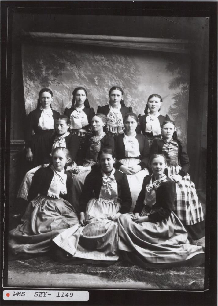 Hópmynd saumakonur. Jórunn Guðmundsdóttir, 2 fv. í miðröð, Björg Sigurðardóttir, 1 f.v. í miðröð, Guðlaug Baldvinsdóttir, Böggvistöðum, Svarfaðardal, 2. f.v., í efstu röð, Hákonía Hákonardóttir, Haga, Barðaströnd, 4. f.v., í efstu röð, Hómfríður Þorláksdóttir, 3. f.v., í miðröð, gift Ísleifi Jónssyni, Ingibjörg Helgadóttir, dóttir Helga Helgasonar, tónskálds, Kristín Guðmundsdóttir, Þorkelshóli, Víðidal, Margrét Sigurðardóttir, 3. f.v., í efstu röð, frá Sámsstöðum, Ólafía, 4. f.v., í miðröð, gift Bessa Einarssyni frá Hraunum, Ragnheiður Björnsdóttir, 1. f.v., í neðstu röð, gift Zimsen, Vilborg Halldórsdóttir, 1. f.v., í efstu röð, gift Gísla.