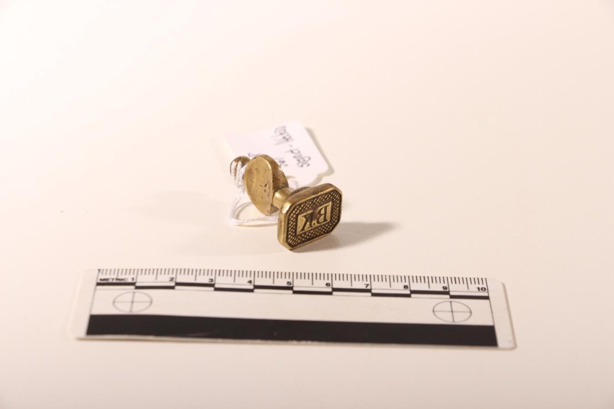 Signet úr messing. H. 3,5 cm. Br. 1,7 cm. D. 2 cm. Stafir á miðri plötu eru B.K. Utan um kassann er þétt tíglamynstur með átt-hyrndu mynstri utan um. Haldið passar fyrir fingur.