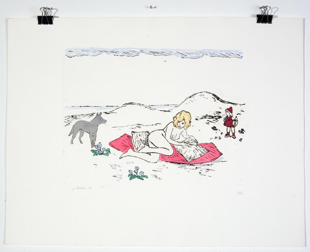 Myndefni: Hólótt strönd, nakin ljóshærð kona fyrir miðju á neonbleikri dýnu. Vinstramegin við konuna er grár hundur, hægra megin við konuna er stelpa í rauðum kjól, með rauða hettu og heldur á körfu (rauðhetta?). Í forgrunni eru 2 blómabúnt (blá blóm, græn laufblöð). Haf og ský eru bláleit- Litirnir virðast vera vatnslitir.- Annað sem ekki hefur verið nefnt á lit, t.d. ströndin er aðeins með svartar útlínur