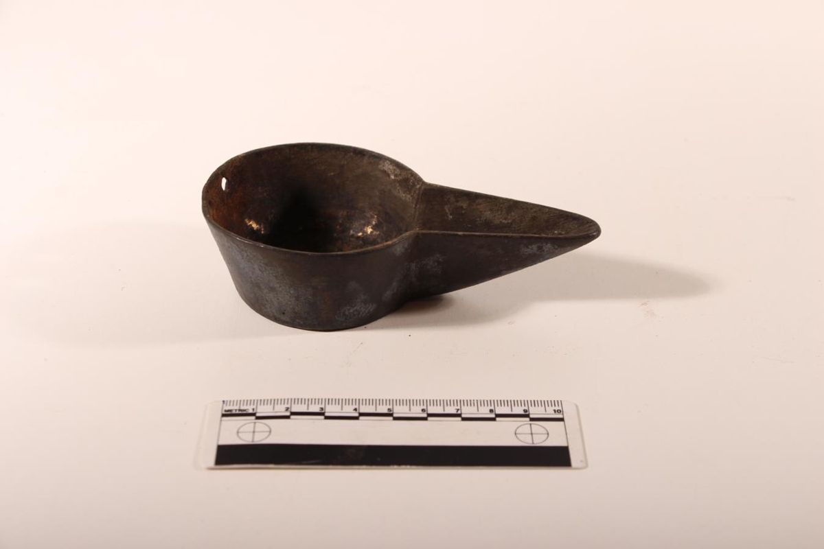Lýsiskola, sennilega úr messing. Þv. skálar er 7,4 cm. Stúturinn er 6 cm langur og hún er 3,4 cm há. Tvö göt eru á skálinni aftan verðri. Götin eru til að hengja hana upp eða festa við veggfestingu. Kolan er orðin mjög svört, en það gyllir í gylltan lit inná milli auk grænnar útfellingar. Einnig er blámi á henni sumstaðar.