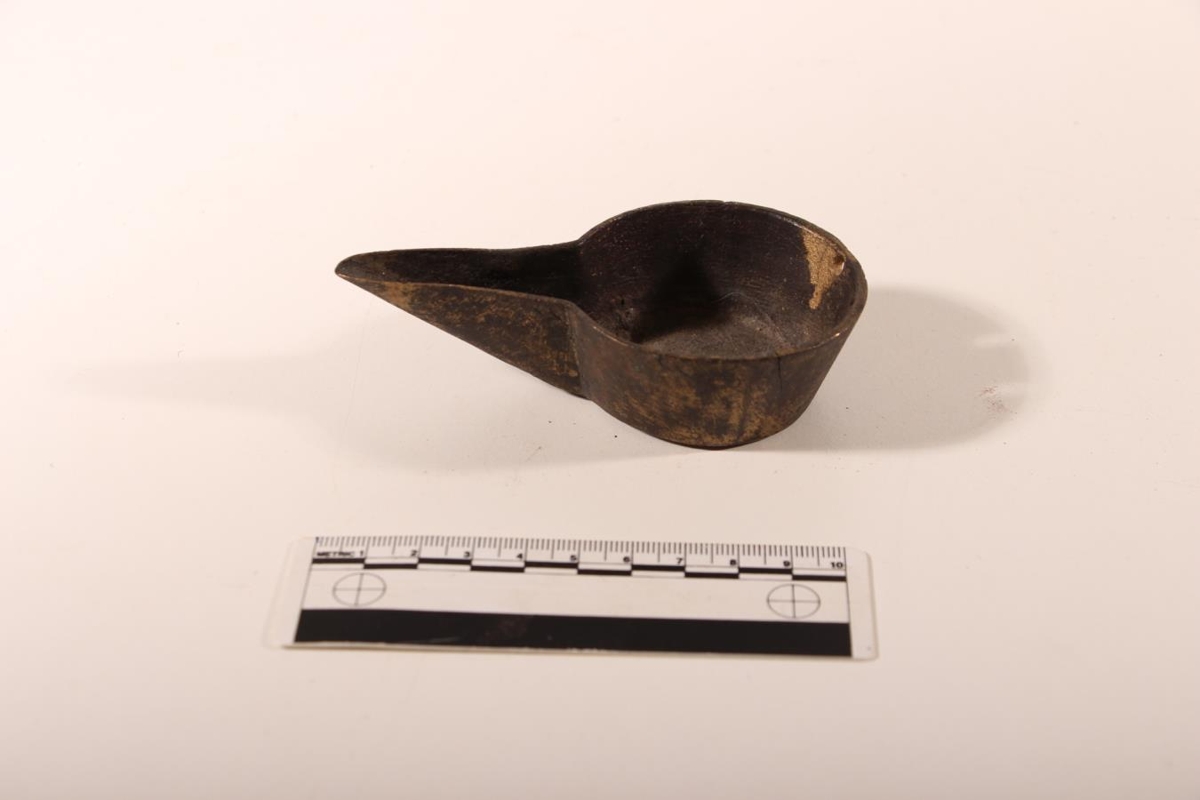 Lýsiskola úr messing. Þv. 5,9 cm. H. 2,5 cm. Stúturinn er 5 cm langur. Botninn er dálítið kúptur niður og ósléttur. Kolan hefur verið pússuð upp að hluta til að utan. Tvö göt eru á henni aftanverðri mjög nálægt brúninni. Götin eru í láréttri línu. Hún er pínu sprungin niður barminn á einum stað.