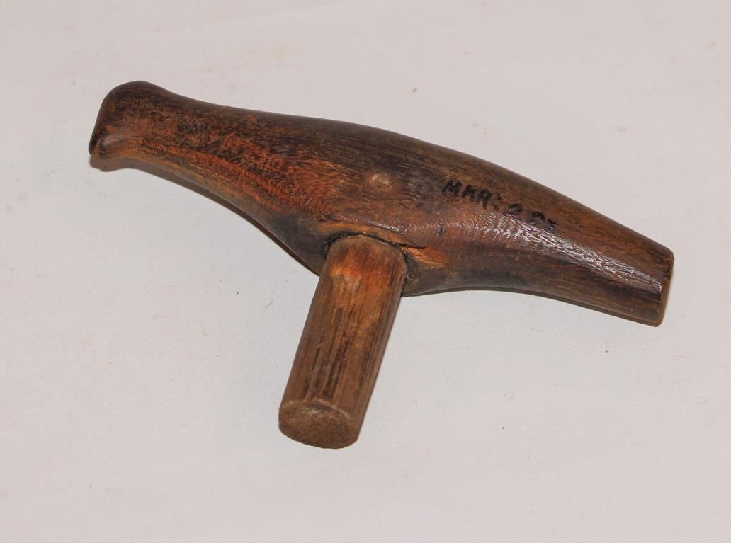 Stafhúnn úr tré. L. 13 cm. Br. 7 cm. H. 2,5 cm. Tálgað selslíki með trétappa niður úr til að setja ofan á staf. Selurinn er trénegldur í gegnum tappann. Haglega smíðaður.
