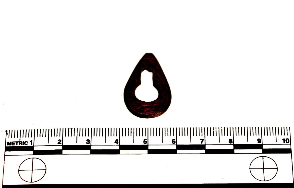 Skráarlauf úr kopar. L. 2,8 cm. Br. 1,7 cm. Dálítið skakkt. Þvermál fyrir lykil er 0,8 cm. Lengd fyrir lykil 1,4 cm. Engin göt eru fyrir festingar. Brúnir laufsins eru rúnaðar, laufið er ójafnt og misþykkt.