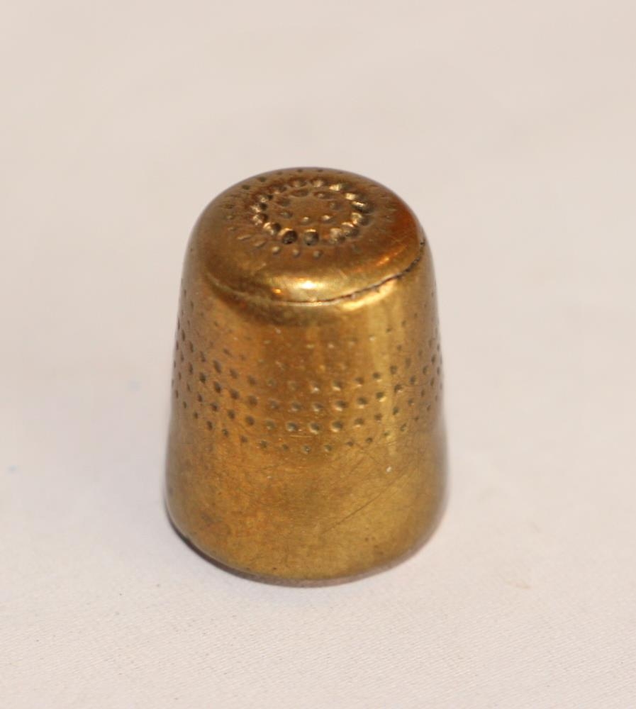 Fingurbjörg úr messing. H. 2,7 cm. Þv. 1,8 cm. Frekar mikið slitin. Punktamynstur (sex umferðir) er á björginni, einnig á toppnum. Punktarnir ná í gegnum björgina á einum hring ofaná. Toppurinn er að losna frá. Er sögð vera íslensk smíði.