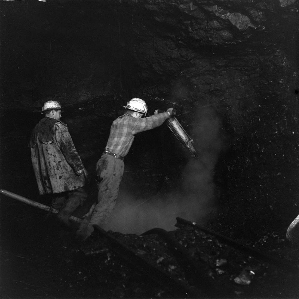 Dalasýsla. Mannvirki og starfsfólk við kolanámuna á Tindum á Skarðsströnd upp úr 1950. Október 1954. Karlmenn við vinnu í námunni, annar er að bora.