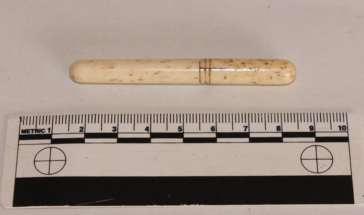 Nálhús úr beini. L. 7,2 cm. Þv. 0,7 cm. Lokið er skrúfað á. Neðst á lokinu eru 2 rendur. Lítur út fyrir að hafa verið rennt í rennibekk. Búið er að vefja tvinna utanum skrúfganginn á endanum. Lokið er orðið svolítið sprungið.