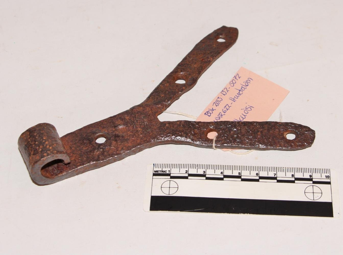 Hurðalöm úr eldsmíðuðu járni. L. 16 cm. Br. 11 cm. Þ. 0,5 cm. Fimm göt eru boruð til að festa á vegg eða hurð. Endinn er beygður saman til að mynda gat fyrir tein til að hurðin geti hreyfst fram og til baka.