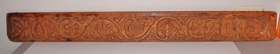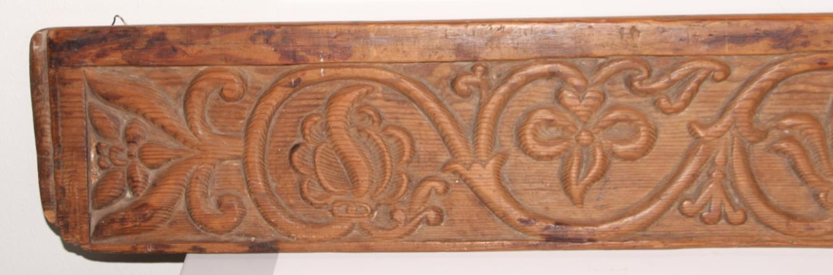 Rúmfjöl úr tré. L. 141 cm. Br. 15 cm. Þ. 1,5. Fallega útskorin með upphleyptu jurtaflúri. Óútskorin rönd er allan hringinn. Hún er 2,3 cm efst, 0,5 cm neðst, 3,5 cm hægra- og vinstra megin (vinstra megin er stallur eftir 1,3 cm).