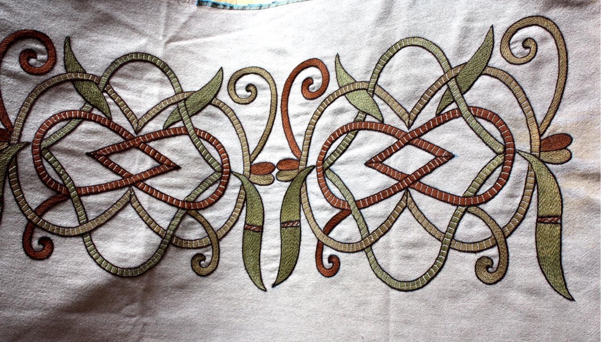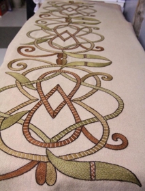 Refilsaumað ullarteppi. Stærð 173 x 77 cm. Brúnt að lit. Mynstrið er flétta að gamalli fyrirmynd. Bandið er úr ull í grænum og brúnum litum. Teppið var í blindramma á vegg þar til um 1990. Það er lítið eitt upplitað og slitið.