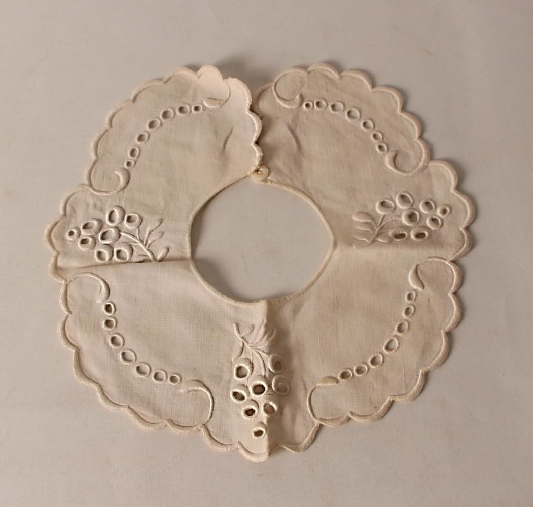 Kragi, úr hvítu líni. Útsaumaður með hvítum bómullarþræði. Með venesíönskum, enskum og frönskum saum, brúnir kappmellaðar. Hnepptur með einni hvítri tölu. Kraginn er sem næst kringlóttur, ætlaður á smábarn. 27 cm í þvermál. Sigríður Benediktsdóttir (d. 1948) saumaði kragann á soninn Þóri á 3. áratug 20. aldar.