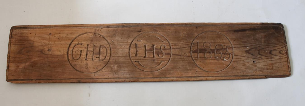 Rúmfjöl úr furu. L. 93,5 cm. Br. 19,7 cm. Á bakhlið, sem er töluvert marin og pikkuð, stendur „RÚMFJÖL ÚR BRIEMSHÚSI SAUÐÁRKRÓKI ÚR EIGU GUNNLAUGS BRIEM". Á bakhliðinni er einnig svartur hringur og blettir. Framan á eru brúnir fjalarinnar strikaðar og á henni eru 3 hringir. Lengst til vinstri eru upphafsstafir GHD. Í miðju kringlunni eru upphafsstafir IHS og lengst til hægri er í þriðju kringlunni ártalið 1865.