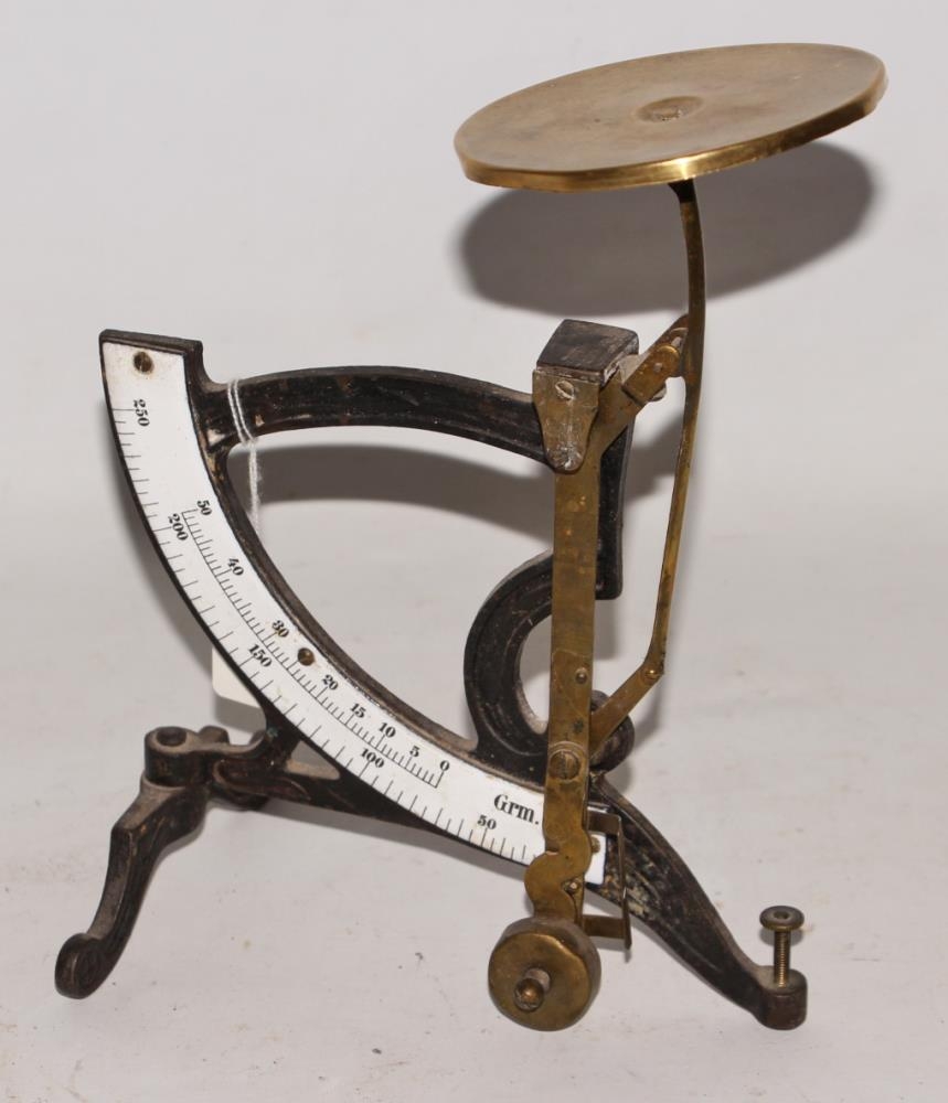 Vigt - bréfavigt úr Briems verslun á Sauðárkróki. Vigtin er úr pottjárni, lituð svört nema töluskífan sem er hvítemaljeruð með svörtum stöfum. Vigtin mælir í grm- grömmum, stikan og stéttin sem vigtað er á eru úr messing. H. 22,5 cm. Skrúfa er á stökum fæti til að festa vigtina niður á borð. Lóðið er á lokuðum hálsi. Vigtin var notuð til að vigta bréf og smávöru. Hún vigtar mest 250 grömm.