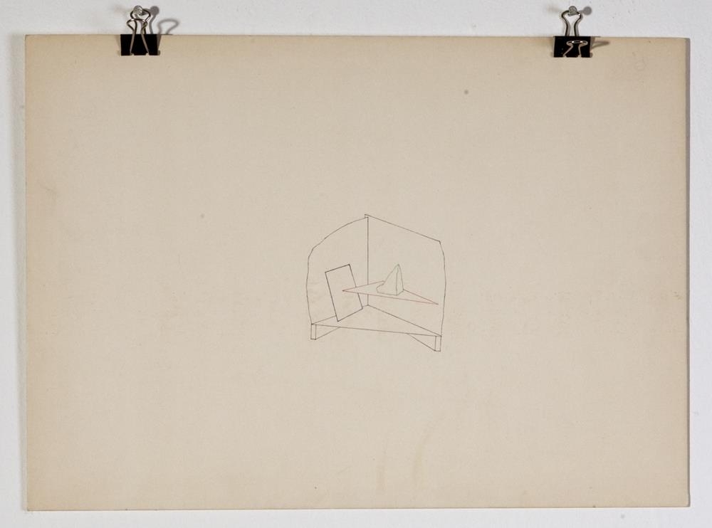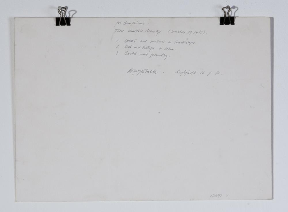 Pennateikningar á hörð spjöld - aðeins útlínur. Spjöldin eru númeruð af listamanni aftan á og titlar hverrar einingar eru skrifaðir aftan á fyrstu myndina:1 Spiral and mirriors in landscape 2 Rock and triangle in corner 3 Earth and geometry. Myndirnar eru frekar litlar á spjöldunum - gæti verið endurgerð á verki frá 1983 (sjá spjald 1)