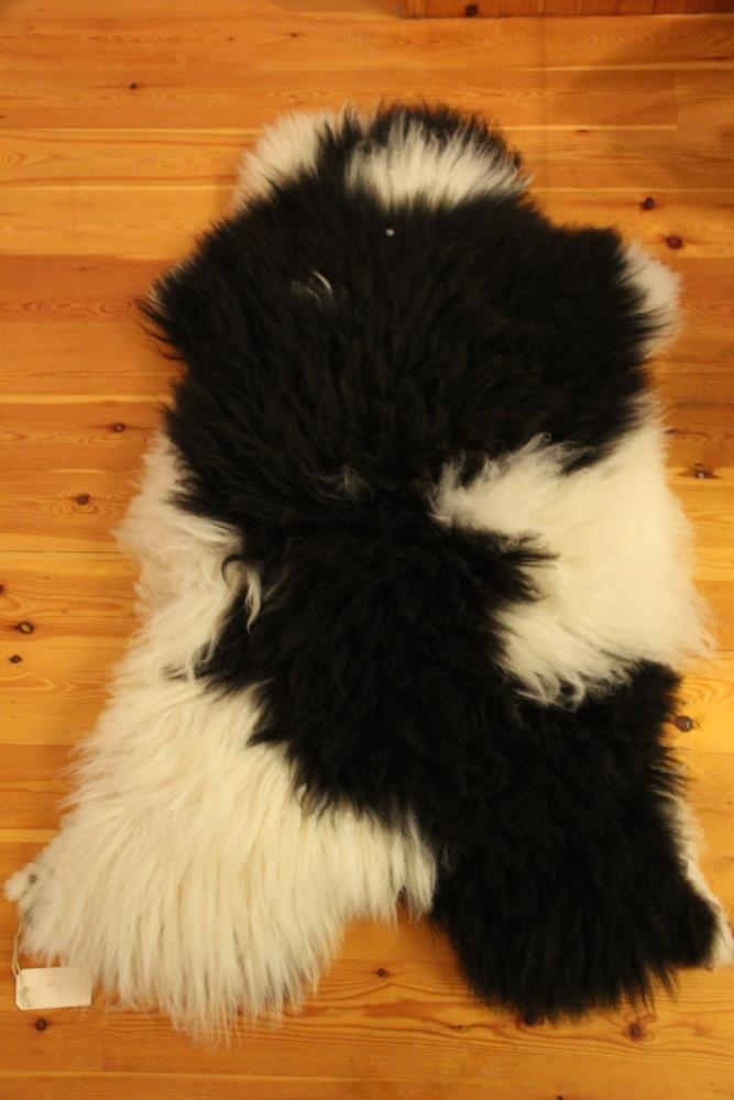 Þessi gæra er sútað skinn ætluð til smásölu. Loðsútuð gæran er hvít og svartflekkótt. Hún er sögð átta fet á lengd en þar er átti við ferfet.