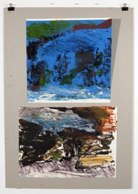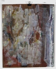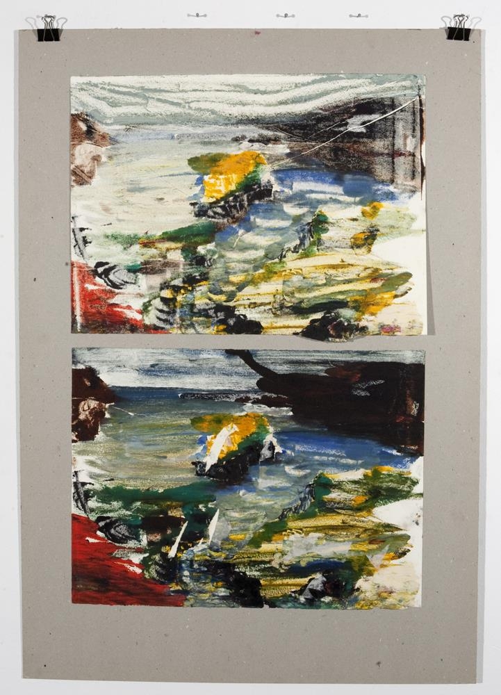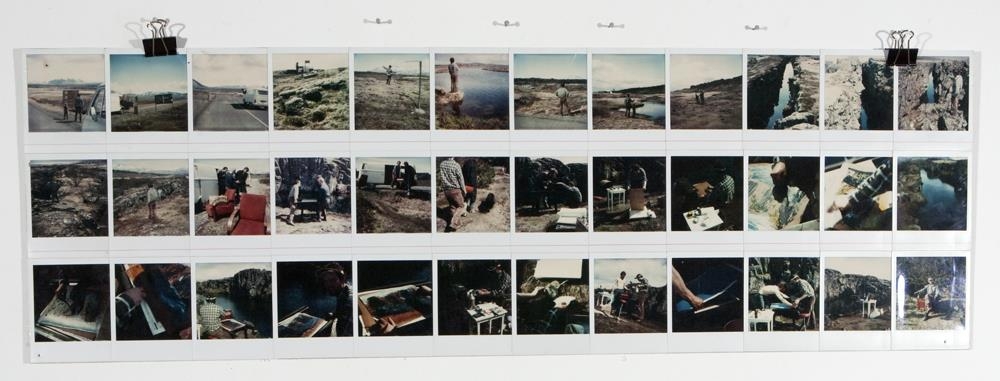 7 einingar allt í allt:- Ljósmyndasyrpa, 36 poloroidmyndir límdará bókbandspappa. Myndunum er raðað í 3 láréttar lengjur, hver með 12 myndum. Syrpan sýnir 3 fullorðna menn og eitt barn koma til Þingvalla á hvítum flutningabíl. Þeir taka úr bílnum 2 stóla og tæki til að vinna grafíkmyndir. 2 mannanna (Björn og e-r) hjálpast við að þrykkja - heimild um grafíkverkin, þ.e. hvernig þau voru unninn- 2 stk lanolíndúkar, notaðir til að vinna grafíkmyndirnar - sést á málnigu sem er á þeim- 6 stk grafíkmyndir, háþrykk. 5 af þeim sambærilegar á ljósum pappír, 1 á bláan pappír. Allar límdar á gráan bókbandspappa, samtals 4spjöld - á 2 spjöldum eru 2 myndir og á hinum tveimur er ein mynd