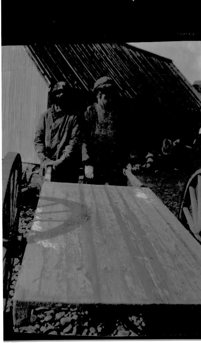 Tveir verkamenn við handvagn/handkerru.