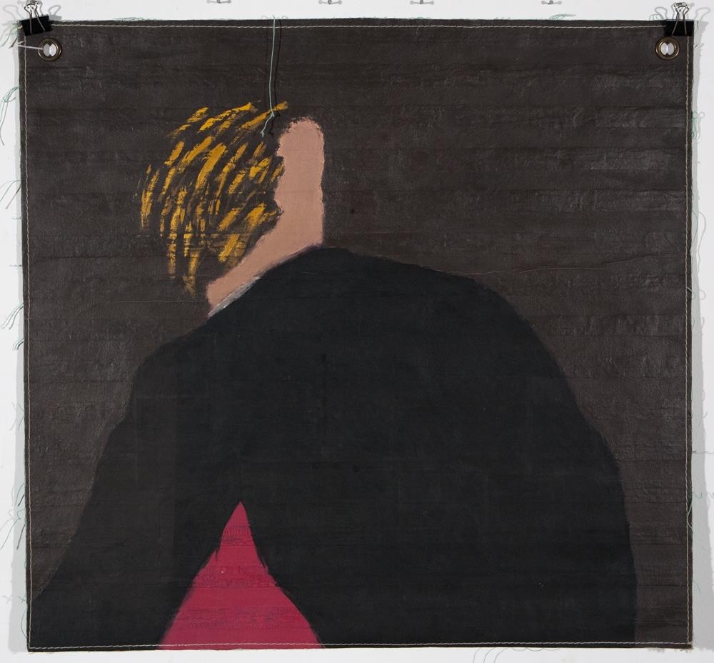 Olíumálverk á striga sem er saumaður á grænan, þykkan segldúk. Til þess að ná fram fram áferð í myndflötinn, notar listamaður dagblöð í grunninn sem hann málar svo yfir. Í efri hornum eru málm kósar, göt í gegn og þannig hægt að hengja uppMyndefnið sýnir mann sem er að snúa sér við - sést í bak hans, hár og vanga. 15.01.09 - V.G. lýsir stellingunni sem maðurinn á myndinni er í: 'Augnablikið þegar einhver snýr höfðinu snögglega til hliðar'