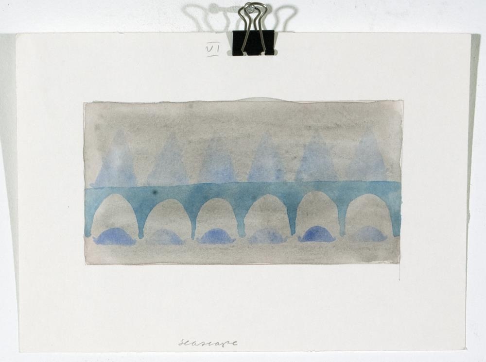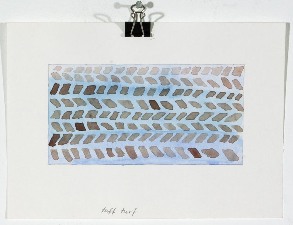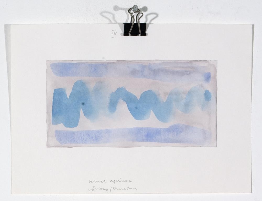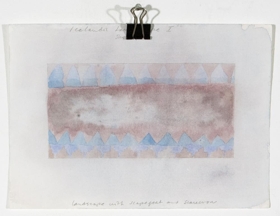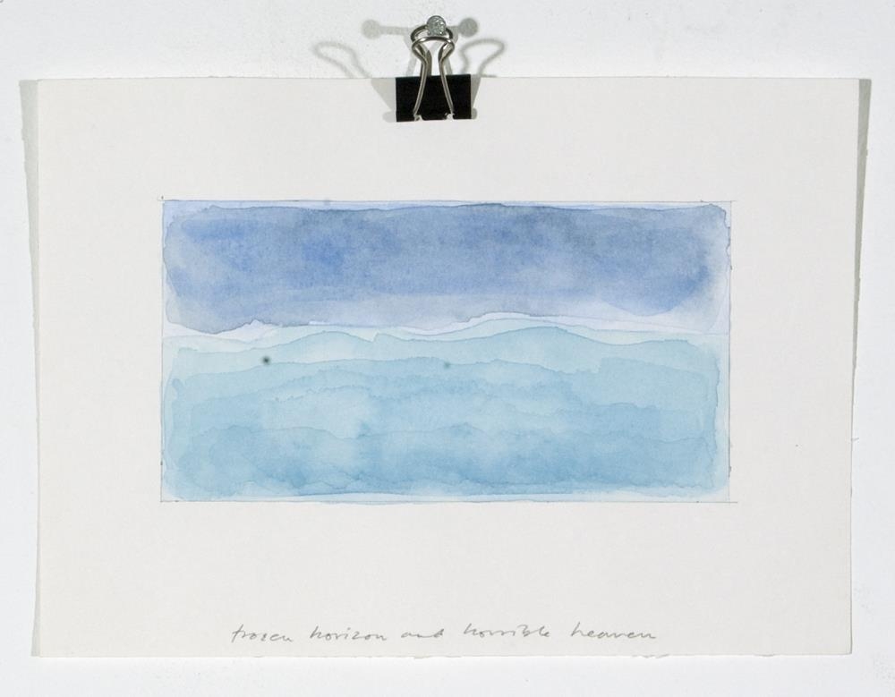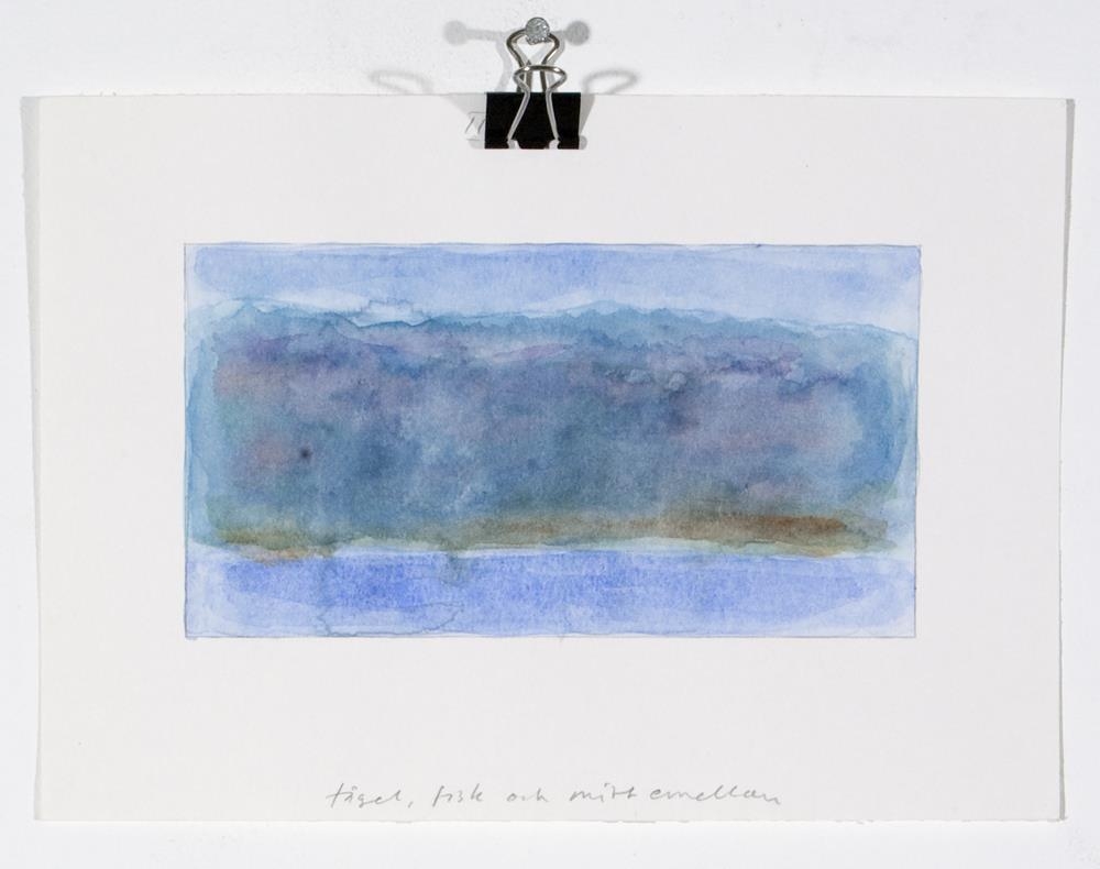 Vatnslitamyndir á þykkan hvítan pappír 1. 'Landscape with scapegoat and scarecrow' - Lárétt breið fjólublá lína, fyrir neðan hann og ofan er röð blárra þríhyringa sem snúa upp. Neðst á myndfleti er önnur röð þríhyrninga. Bakgrunnur er föl-blá/fjólublár 2. 'Tigel, fiskoch mitt emellan' - lárétt breið lína (bláir, grænir og fjólubláir tónar)3. 'Frozen horizon and horrible heaven' - á neðri helming er lárétt lína, samansett úr 6 lögum af bláum tónum. Á efri hluta er lárétt lína í dökkbláum lit4. 'Vernal equinox - vardag jamning' - Bakgrunnur fölfjólublár með smá gráum tón. Efst og neðst á myndfletinum eru bláar beinar línur, á milli þeirra er ein bylgju-lína (líka í bláu)5. 'Tuff- turf' - munstur, samansett úr 4 röðum með 'V'-laga formum sem eru mynduð með brúnum kubbslaga formum. Bakgrunnur blár.6. ' Seascape' - Bakgrunnur grár með smá fjólubláum tón. 6 hálfhringir í bláum tónum, fyrir ofan hvert form eru fölbláir þríyrningar (einnig 6 talsins)