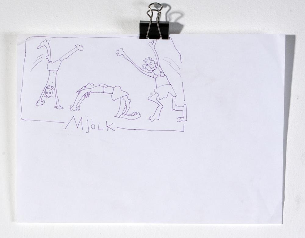 Pennateikning - fjólublár penni á hvítan pappírTeikning af þremur einstaklingum í leikfimisæfingum. Fyrir neðan þá stendur mjólk, teikningin var gerð í tengslum við Mjólkurpóstinn nr. 3