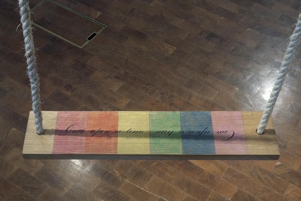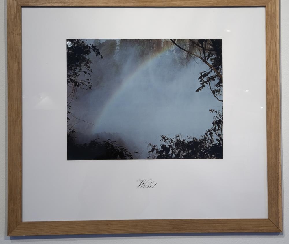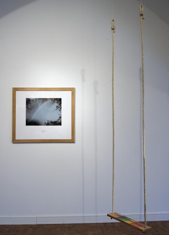 Innsetning samansett af rólu og ljósmynd í rammaLjósmynd: Ljósmynd í lit. Myndefni: trjágreinar, regnbogi, ský, foss, rigning. Hvítt karton er utan um myndina - allt saman í viðarramma. Á pappakartoninu er skrifað 'Wish' með svartri skrautskriftRóla: Viðarróla, tveir kaðlar á hvorum enda til að hengja upp. Sitthvor málmhringurinn festir saman róluna og kaðlana. Efsti hluti rólunnar er skipt í 8 hluta og eru 6 af þeim litaðir með regnbogalitum. Með svartri skrautskrift stendur 'Once upon a time', ritað tvisvar, ofan á litunum. Rólan er varin með lakki