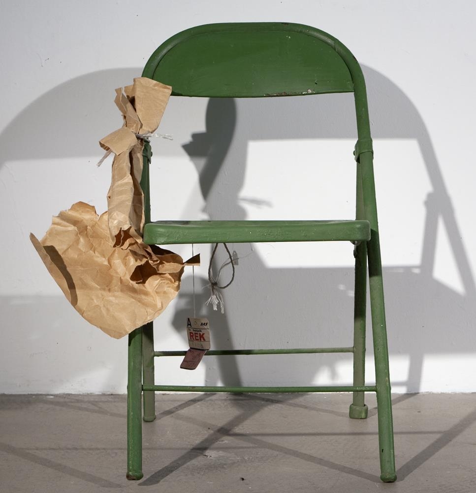 Stóll úr málmi sem er hægt að brjóta saman, málaður grænn. Á einum fæti stólsins er brúnn umbúðarpappír bundinn á með hvítu bómullarbandiMiði frá flugi/flugvelli fastur á stólnum. Á miðanum kemur fram nafn listamanns, flugnúmer, að hluturinn er sendur frá Kaupmannahöfn og að hann eigi að fara til Reykjavíkur (via Mob Shop), ártal (1981).