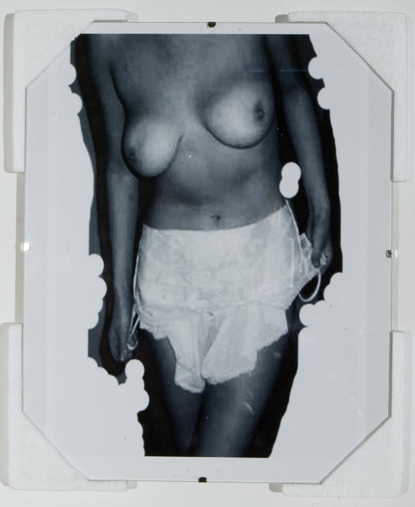 7 ljósmyndir í glerrömmum og hvítu einangrunnarfrauði, 2 sett af netadræsum og flotholtum- 5 ljósmyndir af berum kvenmannsbrjóstum, 1 ljósmynd af blómi í hvítum útlínum á svörtum grunni, 1 ljósmynd af teiknuðum vöðva og æðakerfi handleggs- 2 sett af netadræsum, reipum og svörtum flotholtum