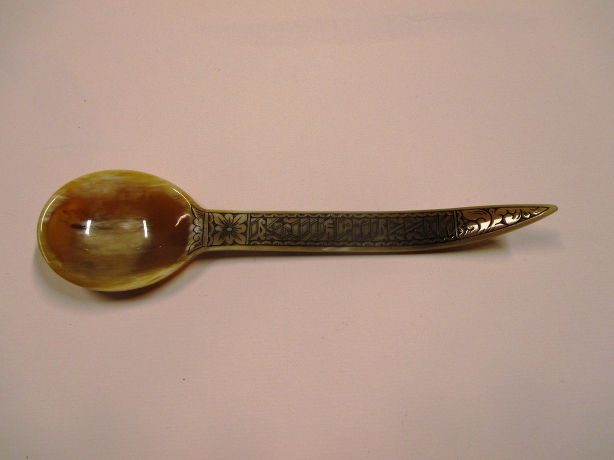 Hornspænir, 19 sm langur, breidd 5 sm. Skaft er áletrað með höfðaletri "Lýður Pálsson", á bakhlið stendur með venjulegu letri Sigga á Grund 2013. Spónninn er úr nautgripahorni, handunninn af Siggu á Grund. Gjöf hennar til Byggðasafns Árnesinga fyrir margháttaða aðstoð og stuðning við listsköpun sína.