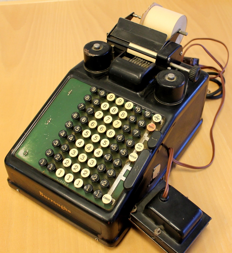 9900-Reiknivél, rafknúin, svört og græn með hvítum og svörtum tökkum. Var í eigu Tómasar Hallgrímssonar bónda og hreppsstjóra á Grímsstöðum í Álftaneshreppi og fyrr líklega í eigu Varnarliðsins sem hann átti viðskipti við. Tegund: Burrough´s, fyrirtækið var stofnað í Bandaríkjunum árið 1886. Módel 3, nr. A-281319. Vélin er líkast til frá því um 1950. Mál á vélinni: 22 x 33 x 22 cm.