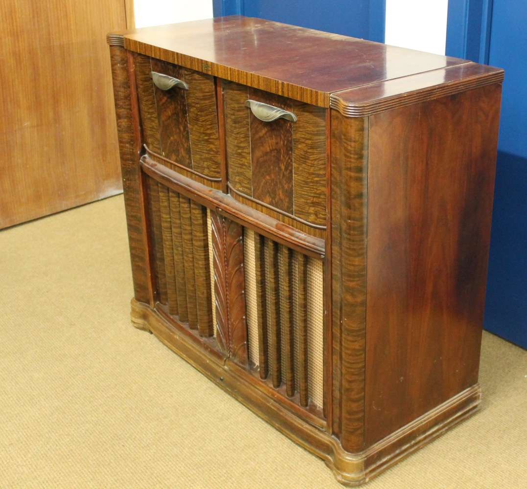 9902 – Hljómtækjasamstæða, árgerð 1946: Zenith Model 12H090 Floor Model Tube Radio Receiver w/ Record Changer. Mál: 101,5 (lengd), 91 (hæð) og 41 (breidd). Var í eigu Tómasar Hallgrímssonar bónda og hreppsstjóra á Grímsstöðum í Álftaneshreppi.