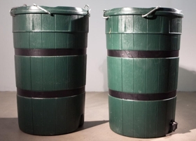 2 stórar, grænar plastfötur (100 lítra?) - Tómar, ekkert lok. 6 göt efst á hvorri tunnu, veglegar lykkjur í götunum og úr þeim keðjur sem sameinast í einn punkt (vantar 3 lykkjur og keðjur á aðra fötuna) Neðst á fötunum eru svartir stútar sem er hægt að opna og loka Þegar verkið var sett upp héngu föturnar í loftinu og í annarri var pepsí og í hinni var kók.