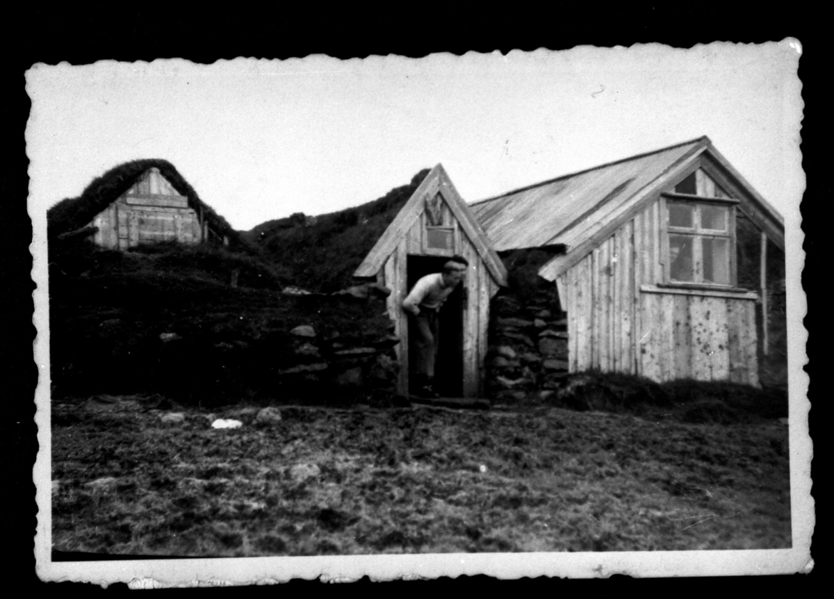 Þriggja bursta torfbær. Maður stendur í húsdyrum og horfir til hliðar.