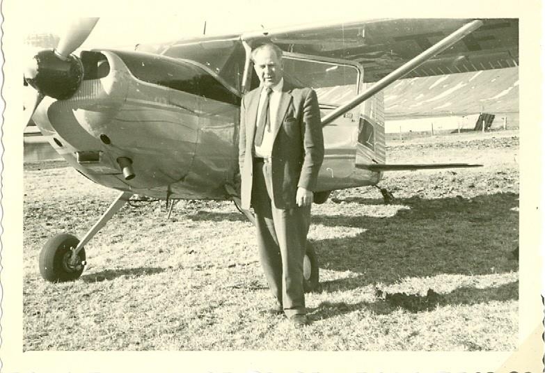 Karlmaður stendur við hlið flugvélar. „Þetta er Björn Pálsson við Sjúkraflugvél sína TF-HIS af gerðinni Cessna 180. Þessi flugvél er nú í eigu og varðveitt á Flugsafni Íslands. Ein af fjölmörgu fréttum um afrek Björns á þessarri flugvél“. (HG 2014, hg@minjasafnid.is)