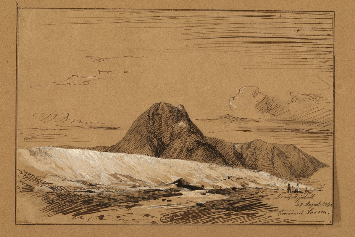 Rönd skriðjökuls. Tjald og menn við það, aðrir við jökulinn. Fjall í bakgrunni. Neðst í meyndflötinn er skrifað Arnafellsjökull 1. August 1846 Emaneul Larsen.