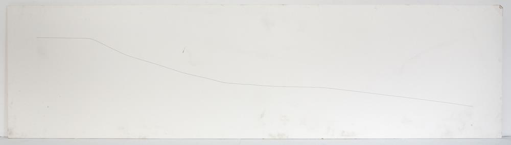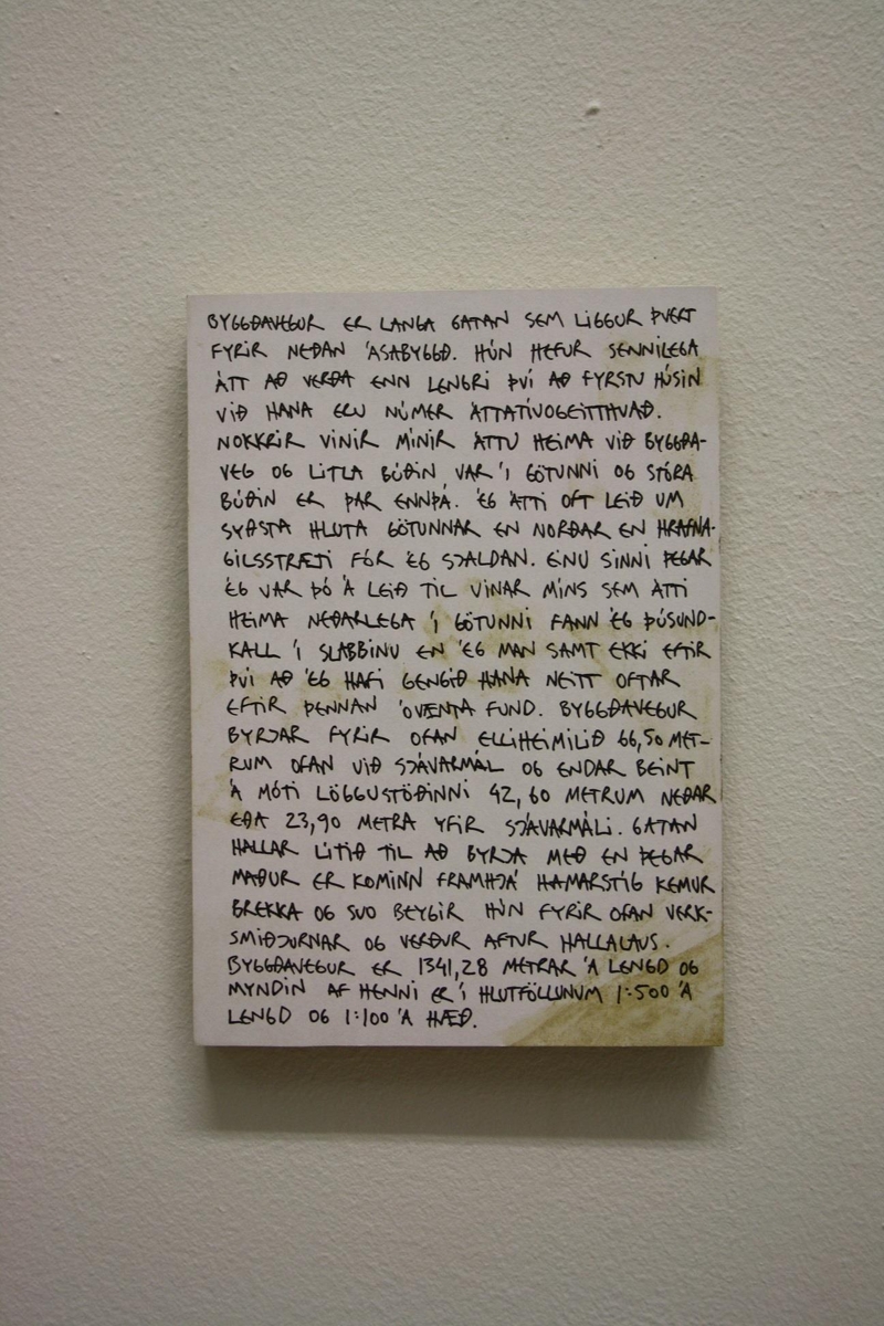 Spónaplata, ein hlið klædd með hvítum pappír. Ein svört, óregluleg pennalína þvert yfir pappírsklædda plötuna. Línan sýnir þverskurð af Byggðaveginum á Akureyri en listamaðurinn bjó eitt sinn þar. Með plötunni fylgir handskrifaður texti sem segir frá verkinu.