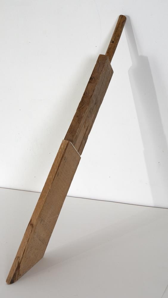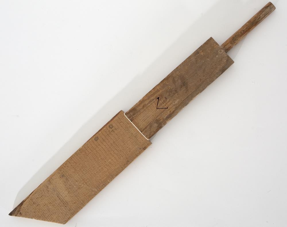 Viður sem minnir á spaða - annar endinn mjókkar og gæti verið handfang, hinn endinn töluvert breiðariTveim spýtum virðist skeytt saman - samskeytin mynda M á miðjum hlutnum. Breiðari endinn er skáskorin