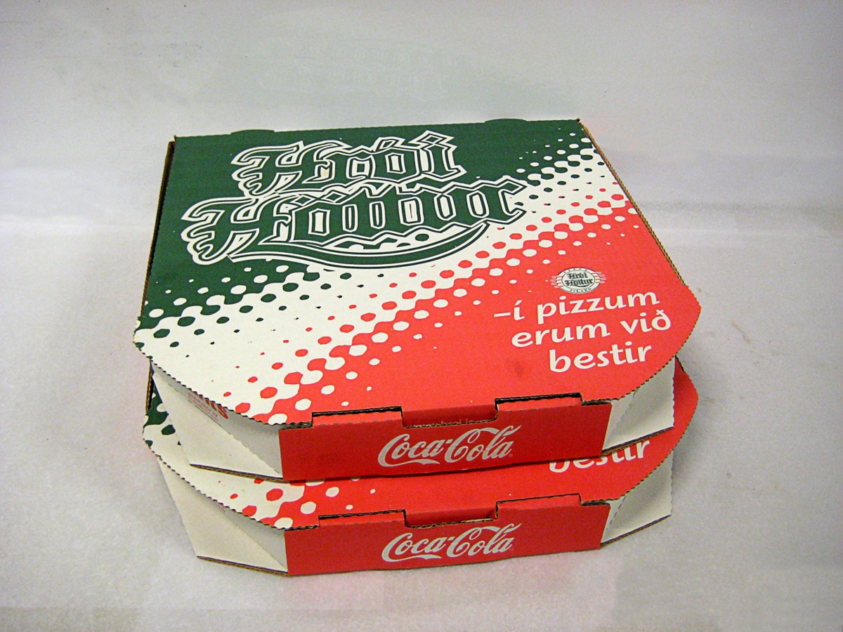 Tveir pizzakassar frá pizzastaðnum Hróa Hetti, sem rekinn var á Selfossi frá tíunda áratug 20. aldar, þangað til í ársbyrjun 2013.