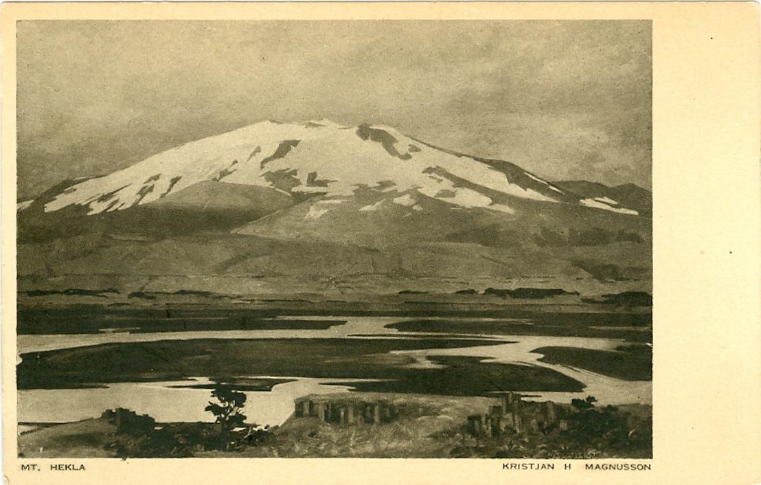 Eftirmynd af málverki af fjalli með snjó. Á í forgrunni. Undir myndina er prentað MT. HEKLA KRISTJAN H MAGNUSSON