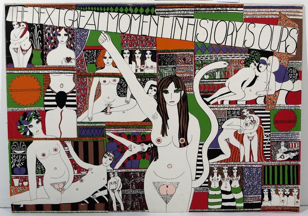 Silkiþrykk í mörgum litum á karton. U.þ.b. 30 persónur - nánast allar berar og flestar í nánum ástarlotum. Fremst fyrir miðju er stærsta persónan - ber kona með uppréttan hægri handlegg, haldandi á spjaldi sem á stendur titill verksins. Snákur kemur undan henni líkt og hann sé hali konunnar. Myndfletinum er ítrekað skipt upp og skiptist milli persónanna. Texti mjög áberandi (hugsanlegt verk um ástarsamband D.I, og Dieter Roth) Ljósmynd tekin áður en verkið fór í innrömmun - rammi ljós, verk fljótandi í rammanum.