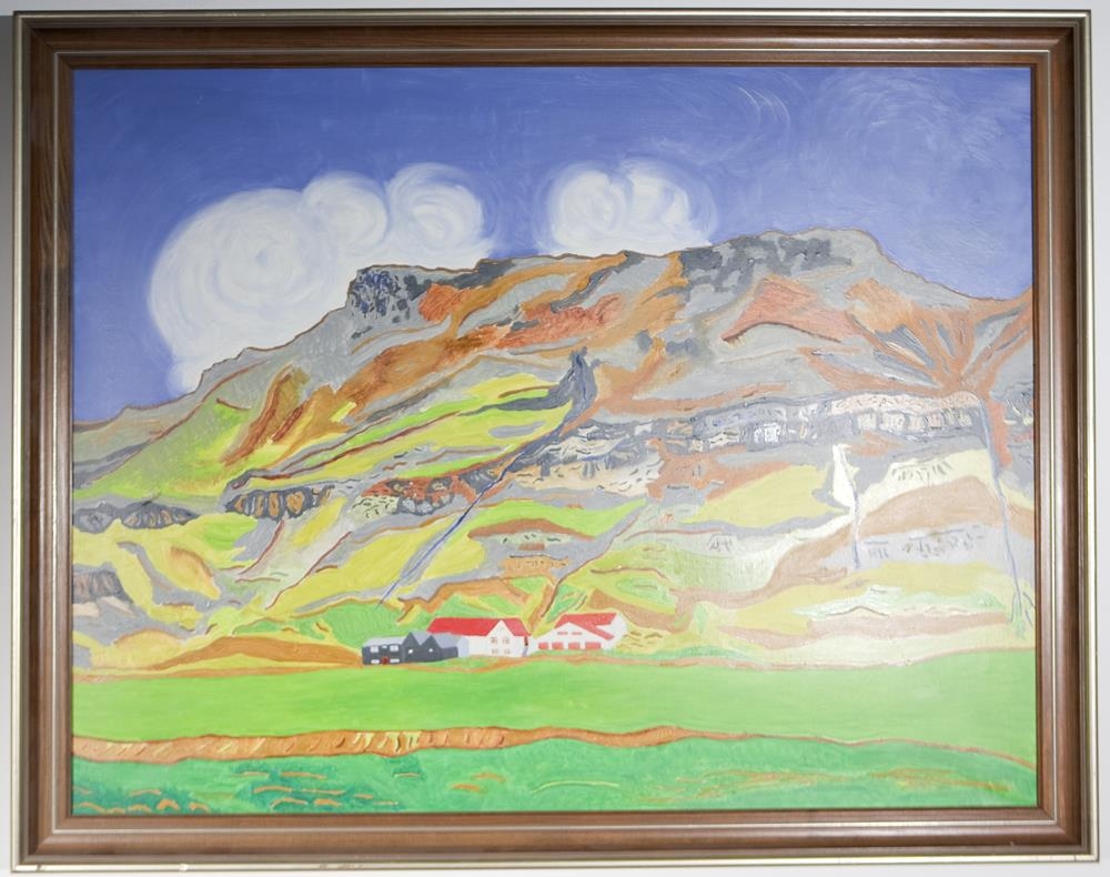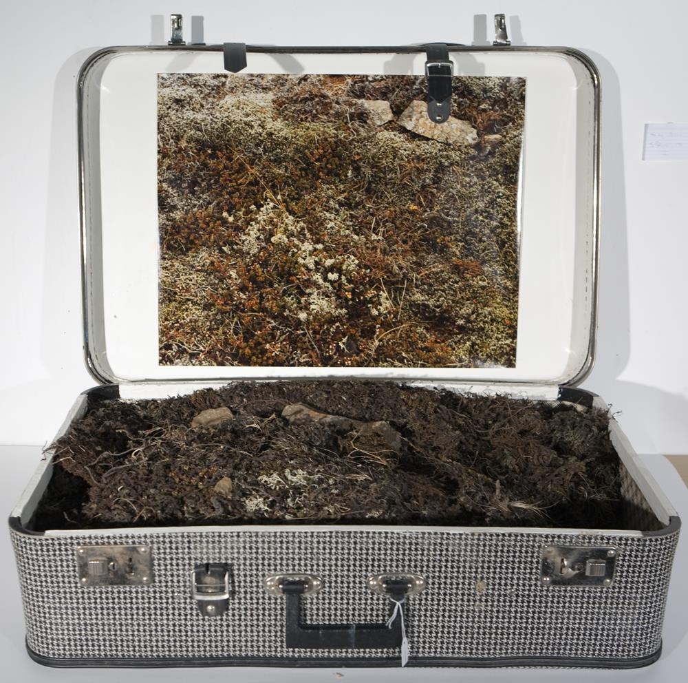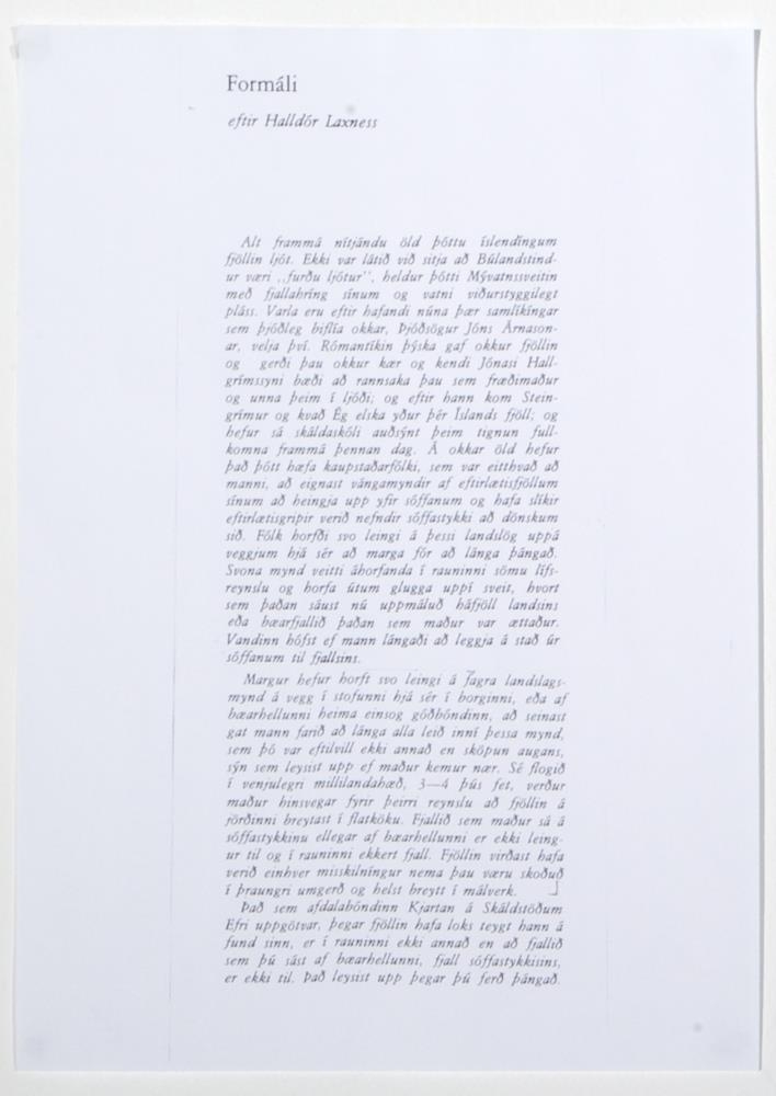 Innsetning í 5 einingum:1. Málverk af fjalli, sést í lítin bóndabæ. 2. Ljósmynd af bónda fyrir utan bóndabæ sem stendur undir fjalli. 3. Ljósmynd af málverkinu inni í stofu (heima hjá frænku Friðriks Þórs og Bjarna Þórarins sem átti heima á Suðurgötu 7). 4. Svört og hvít ferðataska með mosa, mold og grjóti - tekið úr fjallinu við bóndabæinn. 5. Texti sem H.Á. smíðaði úr formála eftir Halldór Laxness.