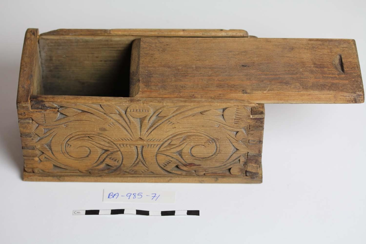 Útskorinn stokkur sem var í eigu Steinunnar Sigurðardóttur í Flatey, smíðaður og skorinn af Jóni Daníelssyni í Helluhrauni, lok og botn vantar[Gísli Arason mögulega bætt því við og lagað]. Skráð nr. 907 í gamla kerfinu, nú skráð sem BA-985-71.