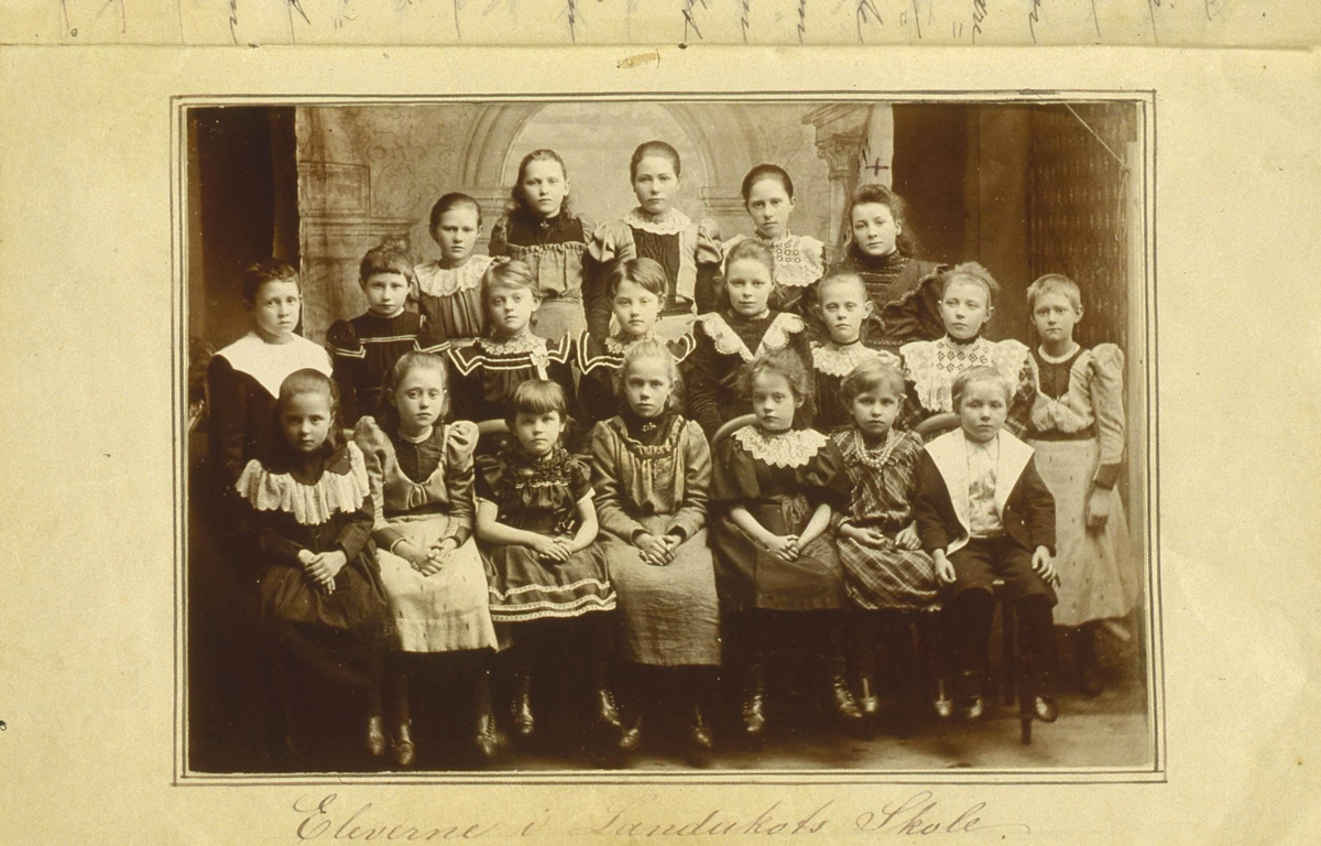 Hópur barna uppstilltur á ljósmyndastofu. Undir myndina er skrifað Eleverne i Landakots Skole.
