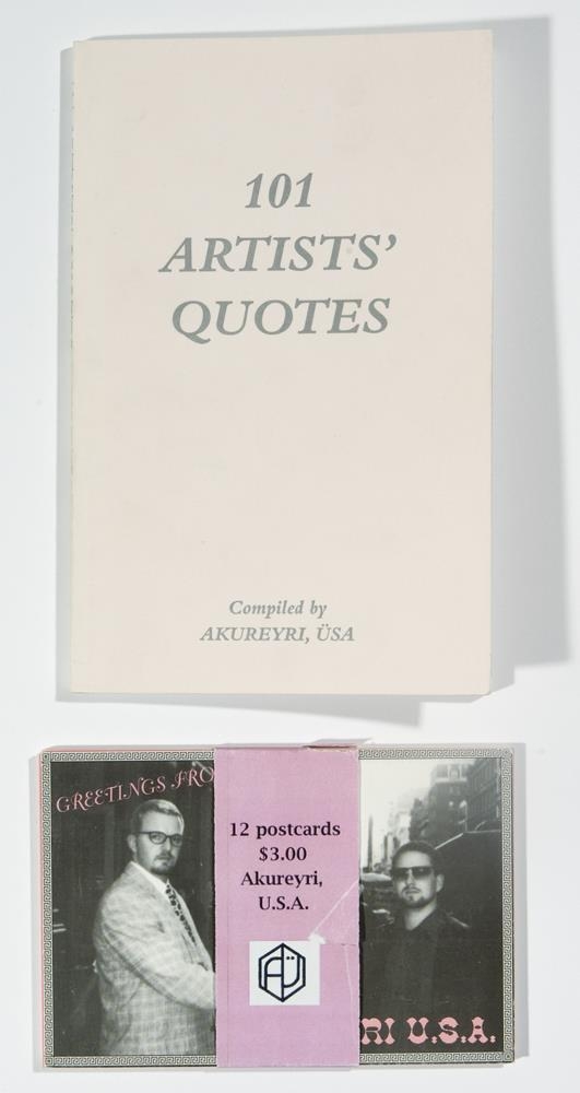 Bókin er 51 bls.Tilvitnanir í heimsfræga listamenn - þó allt hugarfóstur höfunda. Prentað á báðar síður hverrar opnu. Með fylgir 12 póstkort. Kápa bókar er bleik með gráum texta - titill og staðsetning (Akureyri/USA)