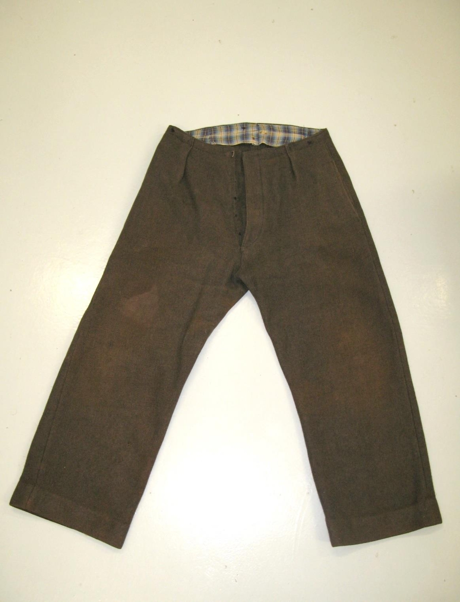 Dökk-mosagrænar karlmannsbuxur úr þykku ullarefni (gæti verið úr heiaofnu vaðmáli), mjög þungar. Buxurnar eru fóðraðar í haldið með bláköflóttu lérefti. Fjórir hnappar hafa verið á klaufinni en eru ekki lengur. Spenna úr járni efst og tveir vasar inn á hvorri hlið. Voru í eigu Stefáns Bjarnasonar frá Klúku í Hjaltastaðaþinghá.