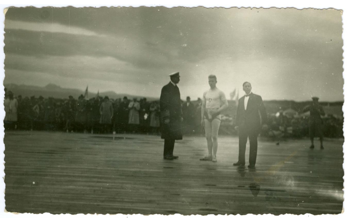 Þingvellir. Þingvallahreppur. Verðlaunaafhending til glímumanns á útskornu horni. Glímumenn og aðrir áhorfendur í bakgrunni. Sigurður Thorarensen glímumaður og verðlaunahafi ásamt Benedikt G. Waage forseta ÍSÍ og Kristjáni Danakonungi. Á einni eru Sigurður og Jóhannes Jóhannesson alþingismaður. Alþingishátíðin 1930. Þrjár myndir.