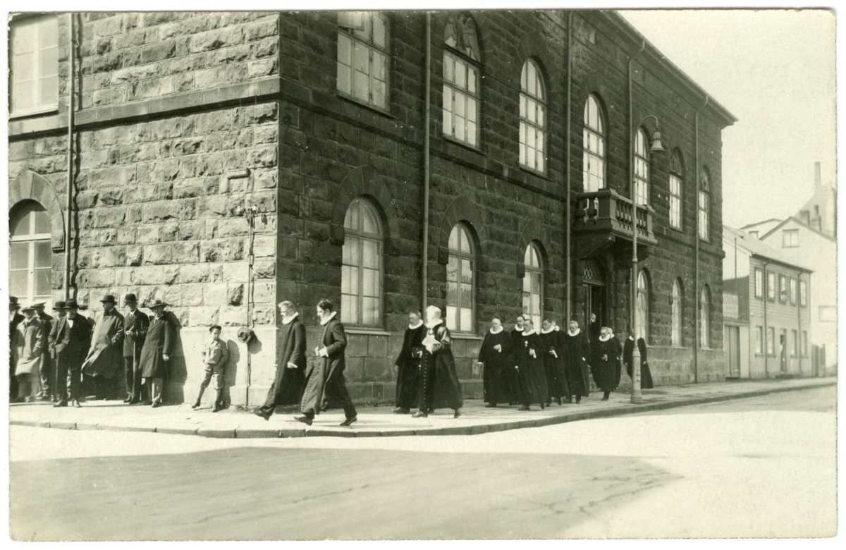Alþingishúsið. Reykjavík. Hópur hempuklæddra presta gengur í röð frá húsi. Nokkrir menn standa undir húsvegg og bíða þeirra. Prestastefna á leið til dómkirkju? Sigurbjörn Einarsson fremst og líklega Jón Helgason aftan við hann. Um 1935.