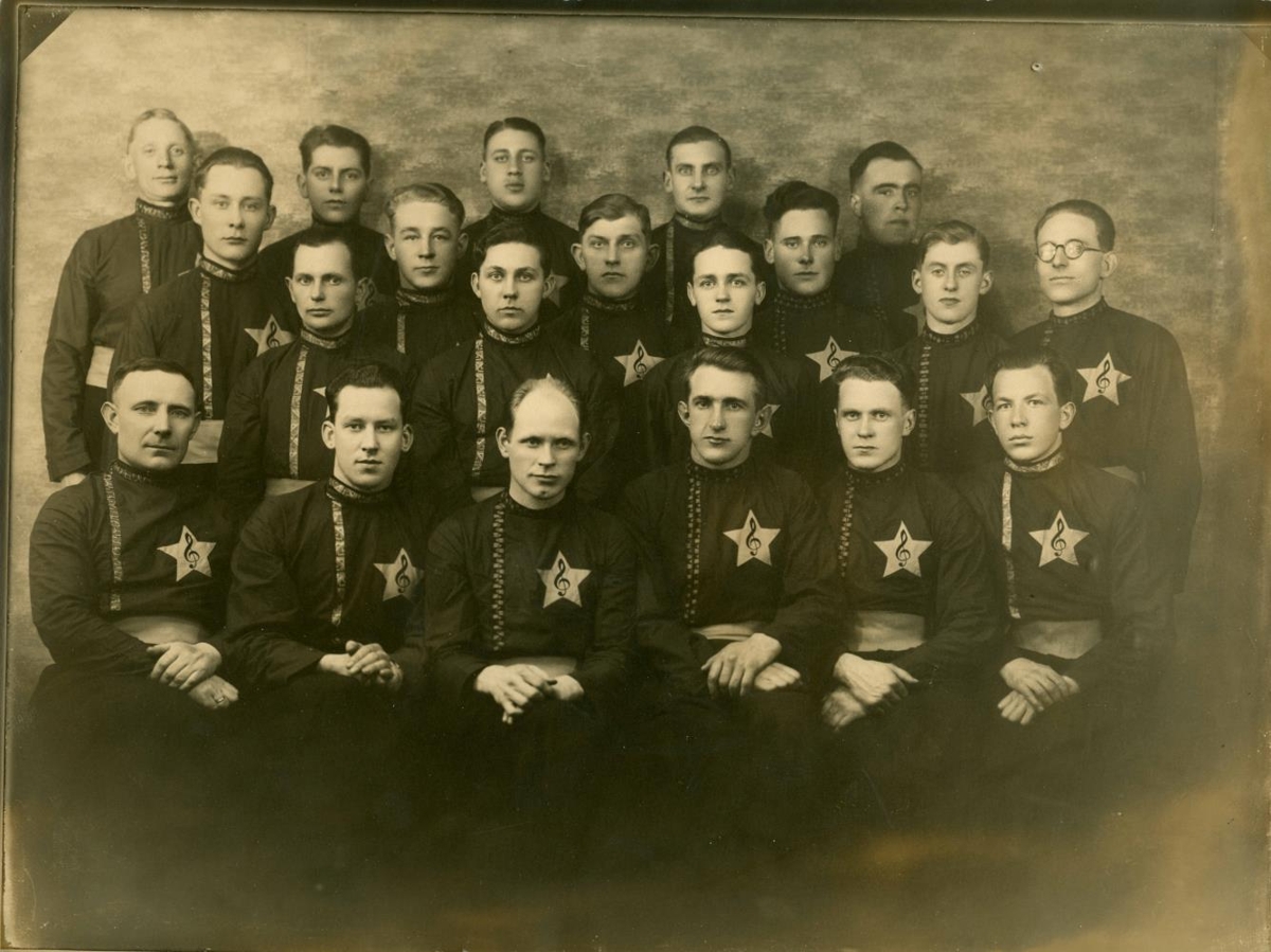 Hópur karlmanna í kósakkabúningum með stjörnu með tónstaf uppstilltur á ljósmyndastofu. Karlakór verkamanna. Stjórnandi á þessum tíma og lengst af var Hallgrímur Jakobsson kennari sem situr þriðji frá vinstri fremst. Í fremstu röð frá vinstri Páll Þóroddsson, Valdimar Leonharðsson, Hallgrímur Jakobsson, Baldur Ólafsson, Aðalsteinn Sigurðsson, og óþekktur. Í næstu röð fyrir aftan frá vinstri: Gunnar Sigurmundsson, Eggert Jóhannesson, Eiríkur Þorleifsson, Sverrir Kristjánsson. Þar fyrir aftan frá vinstri.: Jón Pétursson, Einar Ólafsson, Guðmundur Þorkelsson verkamaður, Guðmundur Þorkelsson smiður. Einar Jórmann Jónsson yst til hægri við þessar tvær raðir. Aftasta röð frá vinstri: Jóhannes Ólafsson, Stefán Ögmundsson, Egill Gestsson, Guðbjörn Ingvarsson og Jóhannes Bjarnason. Sjá Þjóðviljinn 1. desember 1974.