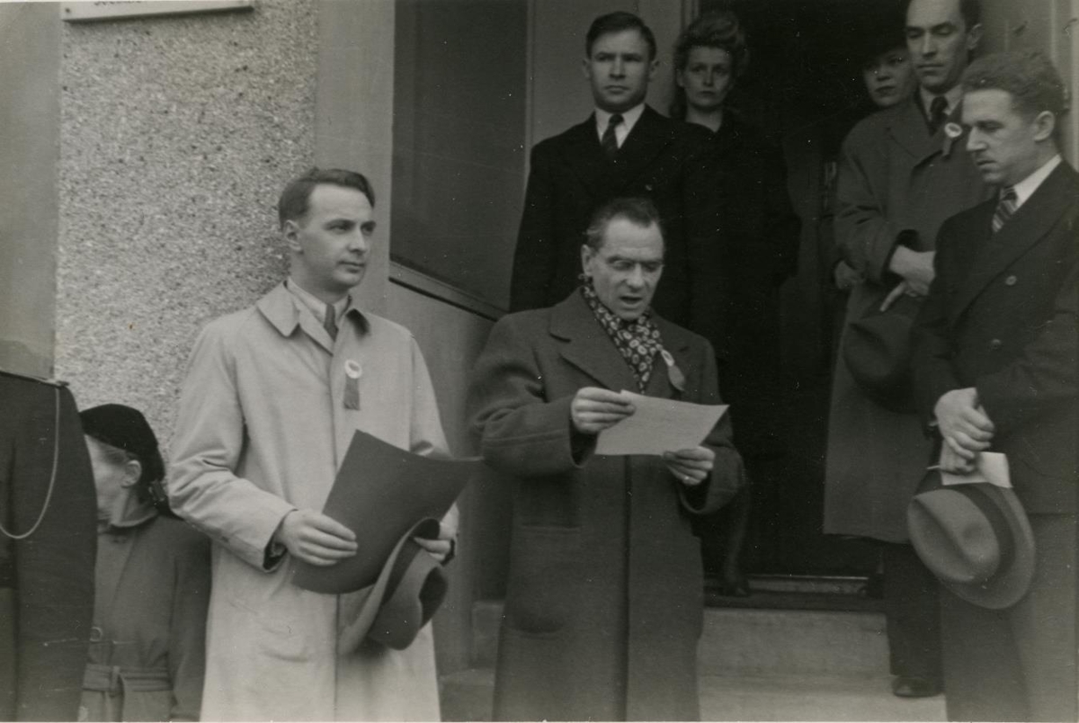 Mótmælaskjal lesið upp við sendiráð, greina má nafn þess á skilti á húsinu. Soviet Socialist Republic. Menn með merki dagsins í barmi, lögregla, mannfjöldi. Um 1950. Sex myndir.